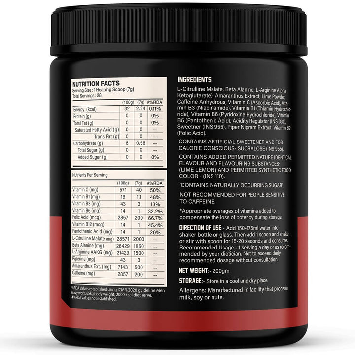 To make you workout better we need better energy & strength. Having optimum energy helps to workout properly and with right intensity. Low energy during high intensity workout can also lead to injuries. Energy and Strength not only helps you to workout with high intensity but also helps you to workout for longer duration. 3500mg of L-Citrulline Malate & L-Arginine AAKG helps in Nitric Oxide (NO) production which increases the blood flow helping to increase the ATP which indirectly increases the overall energy and also helps to increase muscle pump. Increased blood flow supply also helps to supply more nutrients through blood to muscles and different organs of body.