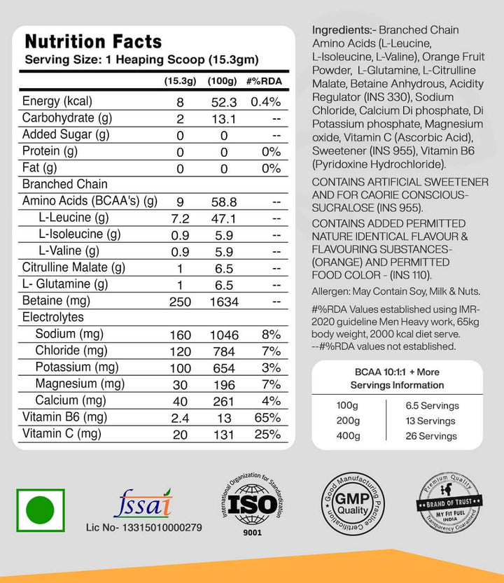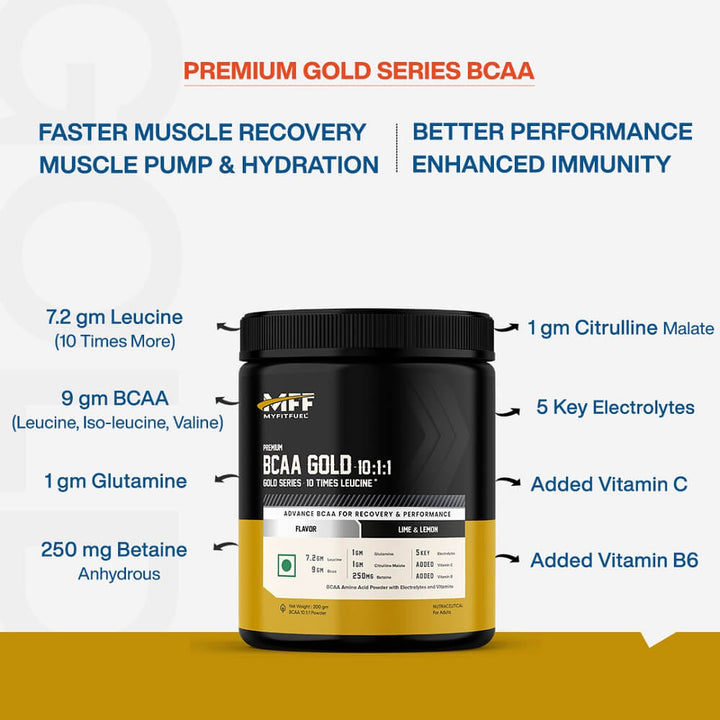 The BCAA stands for Branched Chained Amino Acid which comes under the essential type of amino acid and is made up of L-Leucine, Iso-leucine&Valine. These essential amino acids are not synthesized in our body and hence should be taken from other sources. The Gold Series BCAA offered by MyFitFuel has 10 times more Leucine as compared to 2:1:1 blend which might only contain twice the leucine ratio to L-Valine and Iso-leucine.